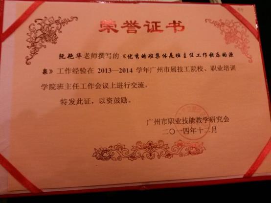 我校阮艳华等老师被评为广州市属技工院校优秀主任、广州市技工教育科研先进个人