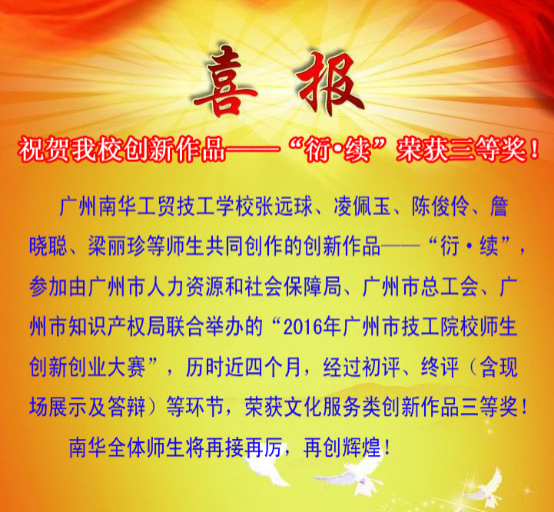 我校师生作品“衍·续”获“2016年广州市技工院校师生创新创业大赛·文化服务类三等奖”
